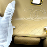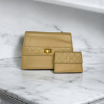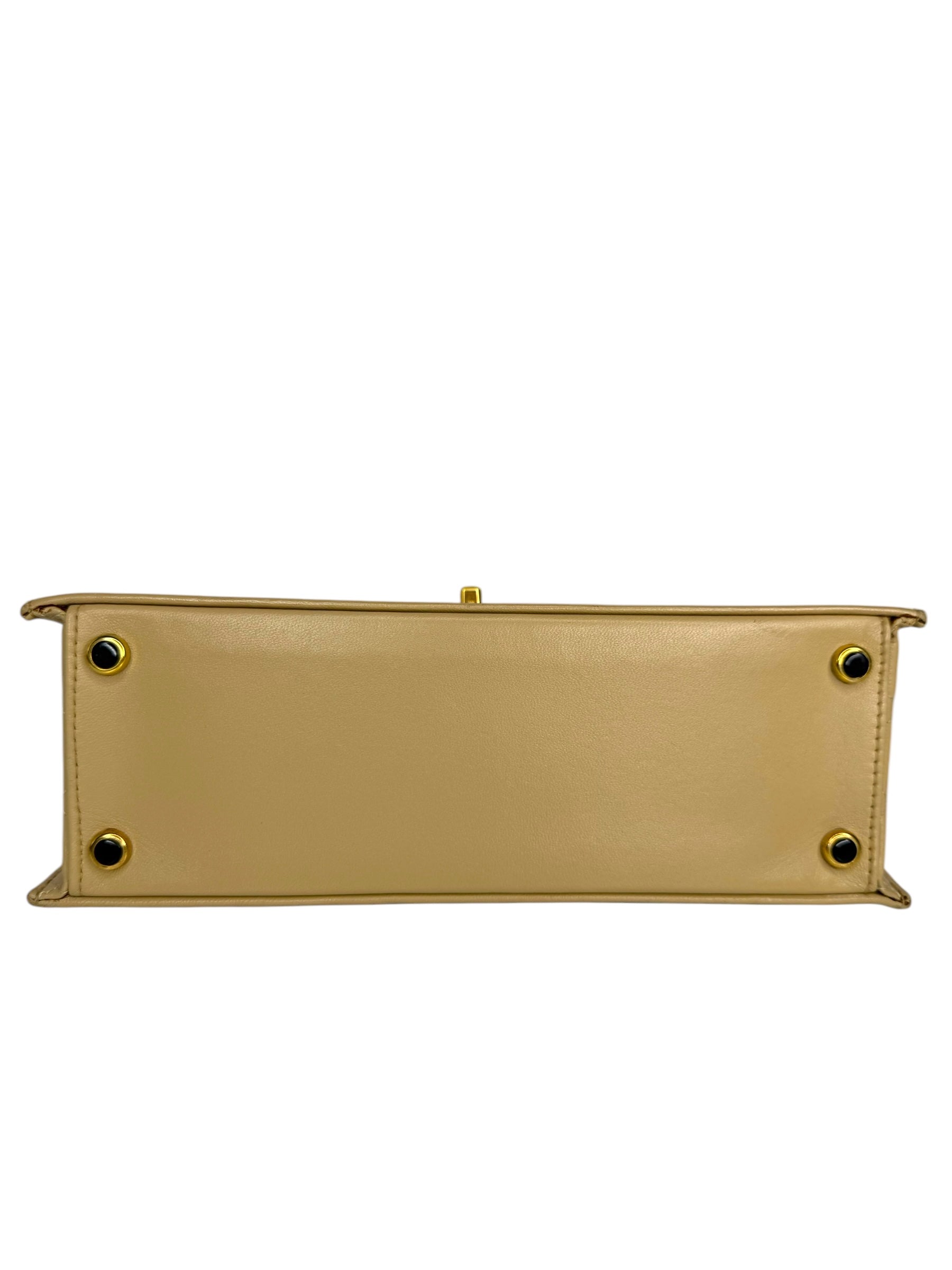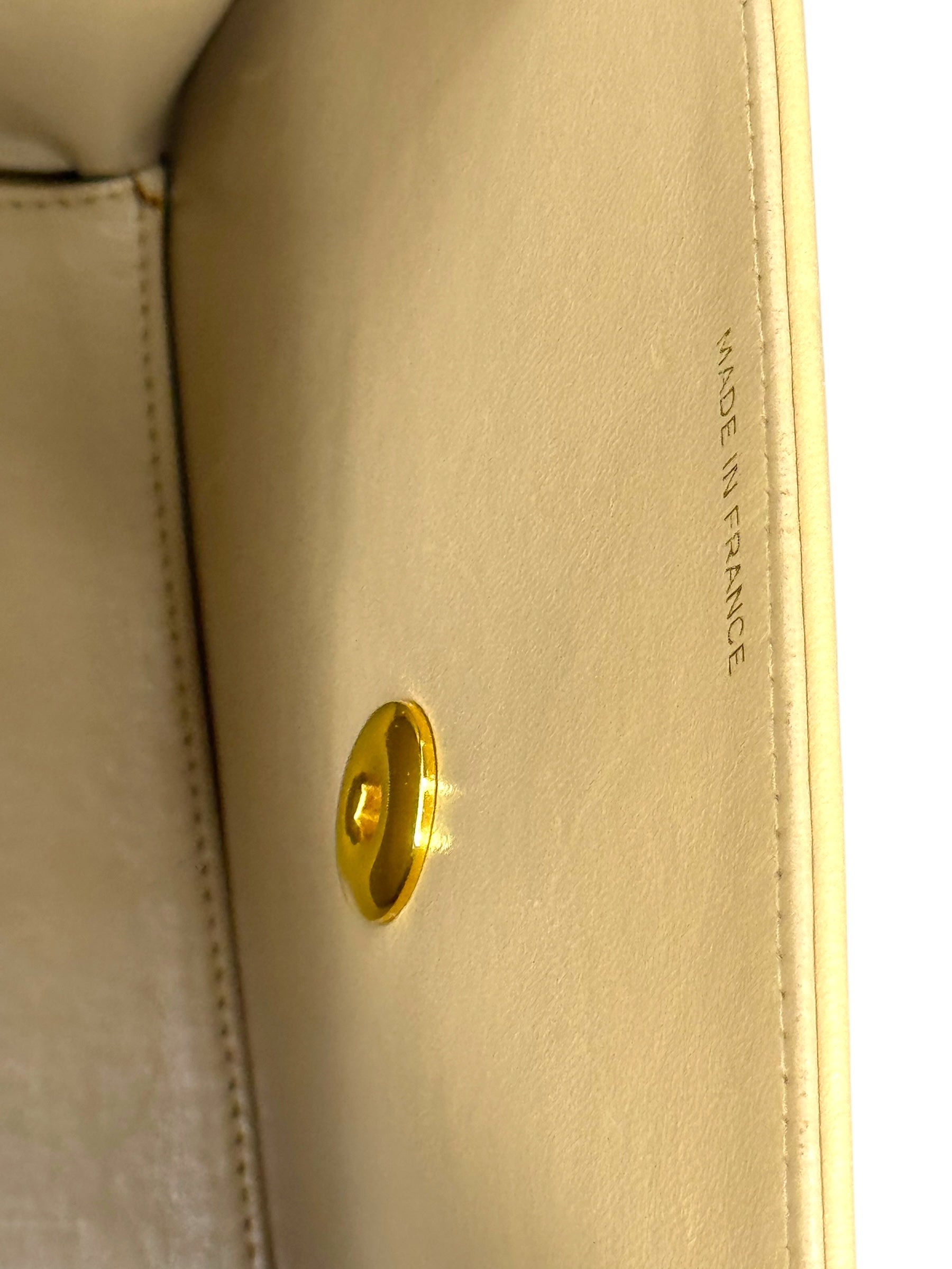 A timeless and sophisticated piece, this Chanel Trapezoid Shoulder Bag is crafted from elegant beige leather, making it a versatile choice for any occasion. Designed with a structured silhouette and classic Chanel craftsmanship, this bag is both stylish and functional. Includes baby Chanel piece, that slides into the interior pockets.