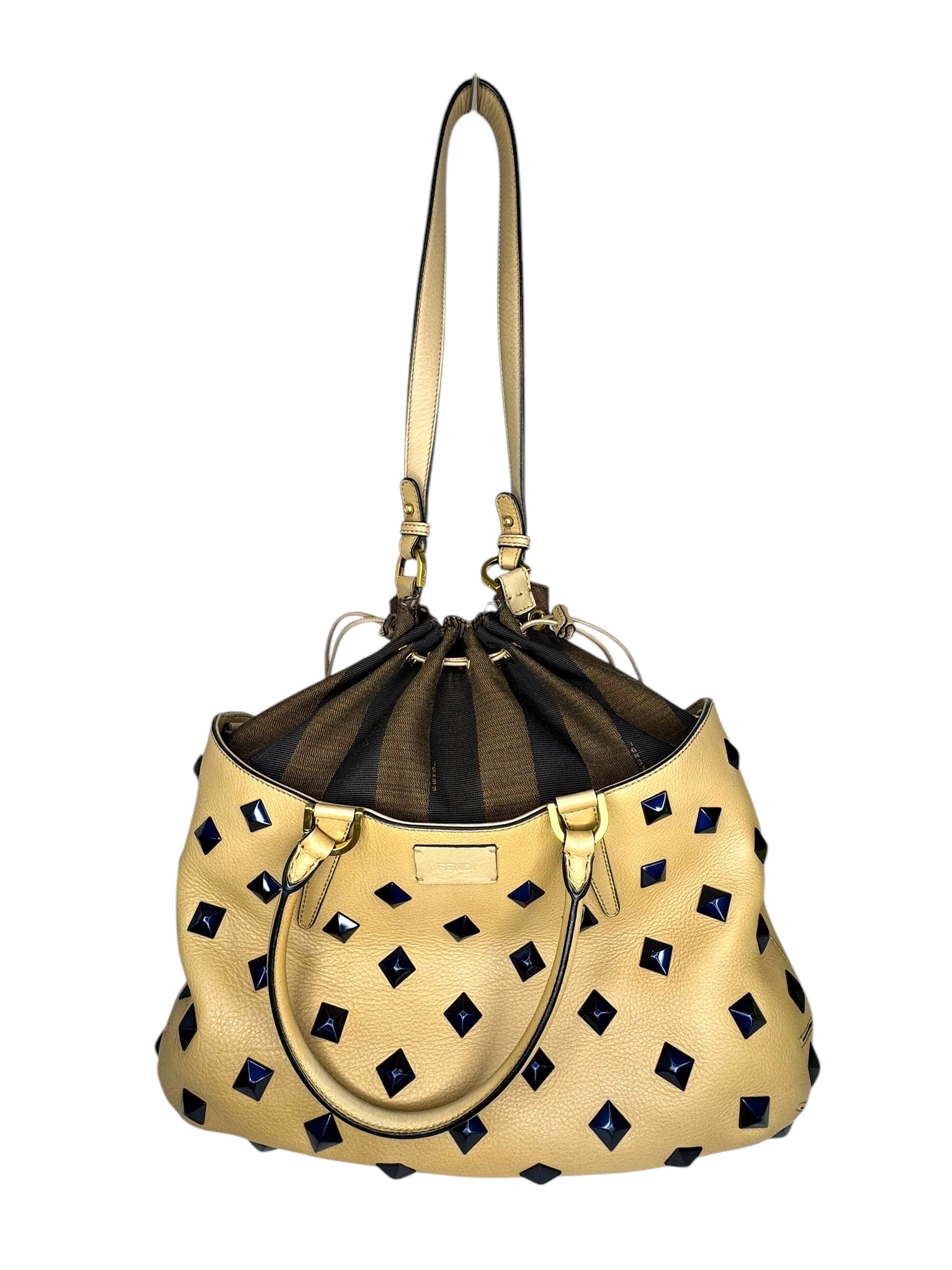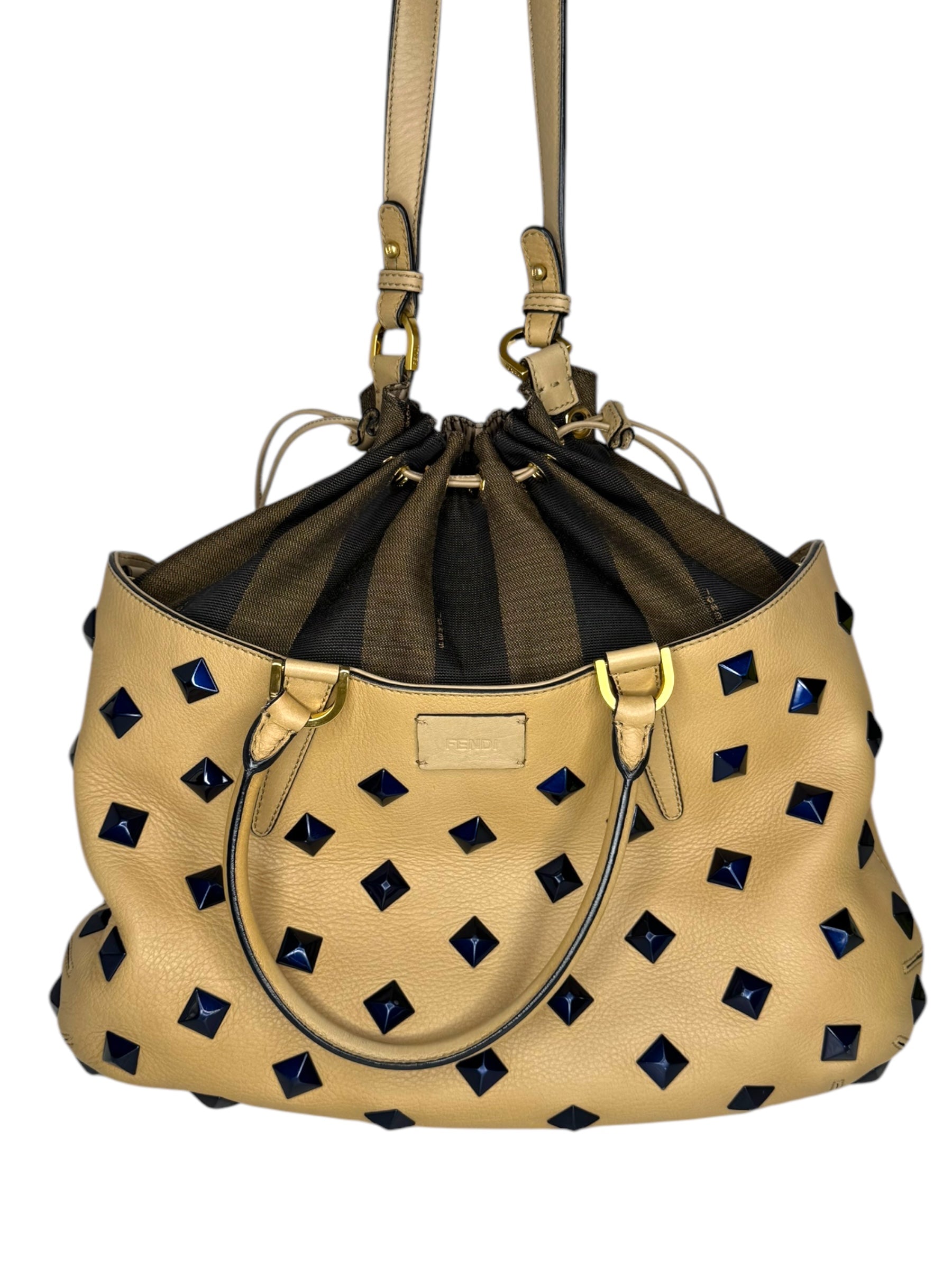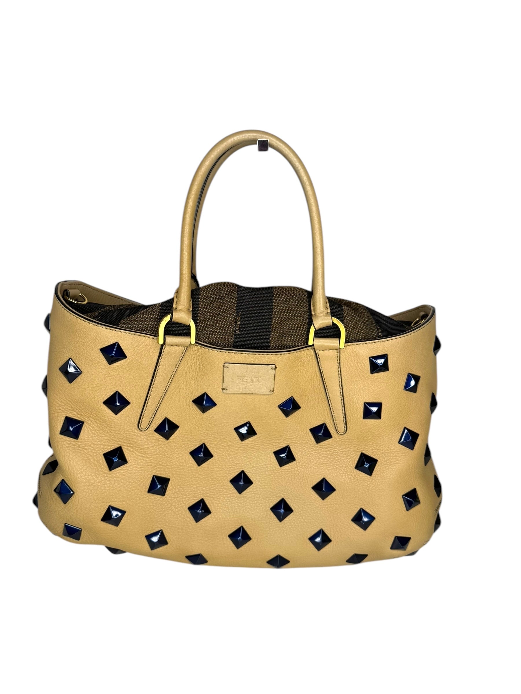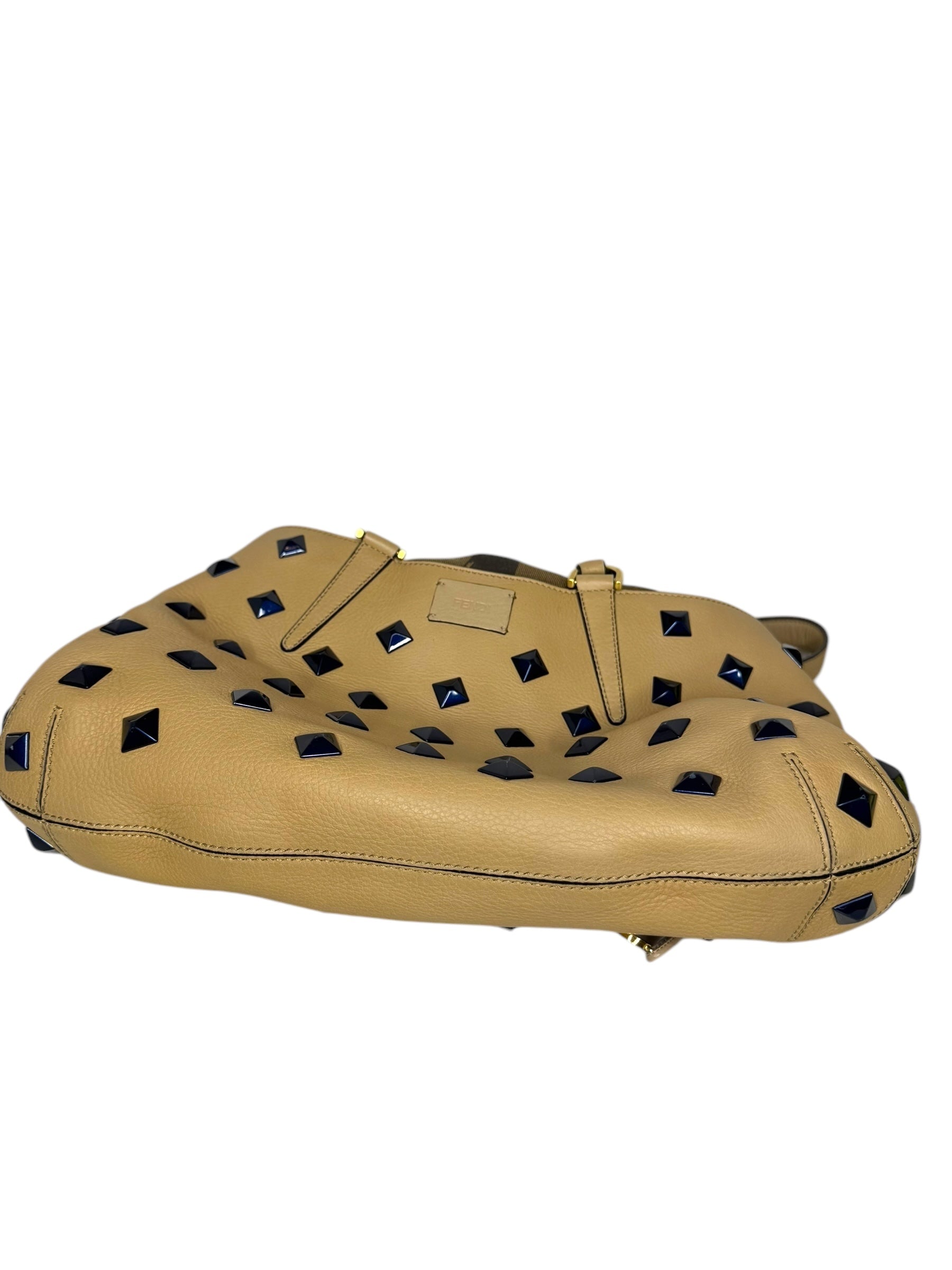 A stylish and sophisticated piece from Fendi’s 2012 Collection, the B Fab Tote is crafted from luxurious neutral leather with the brand’s signature Pequin pattern. Featuring gold-tone hardware and studded accents, this tote blends elegance with a touch of modern edge.