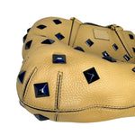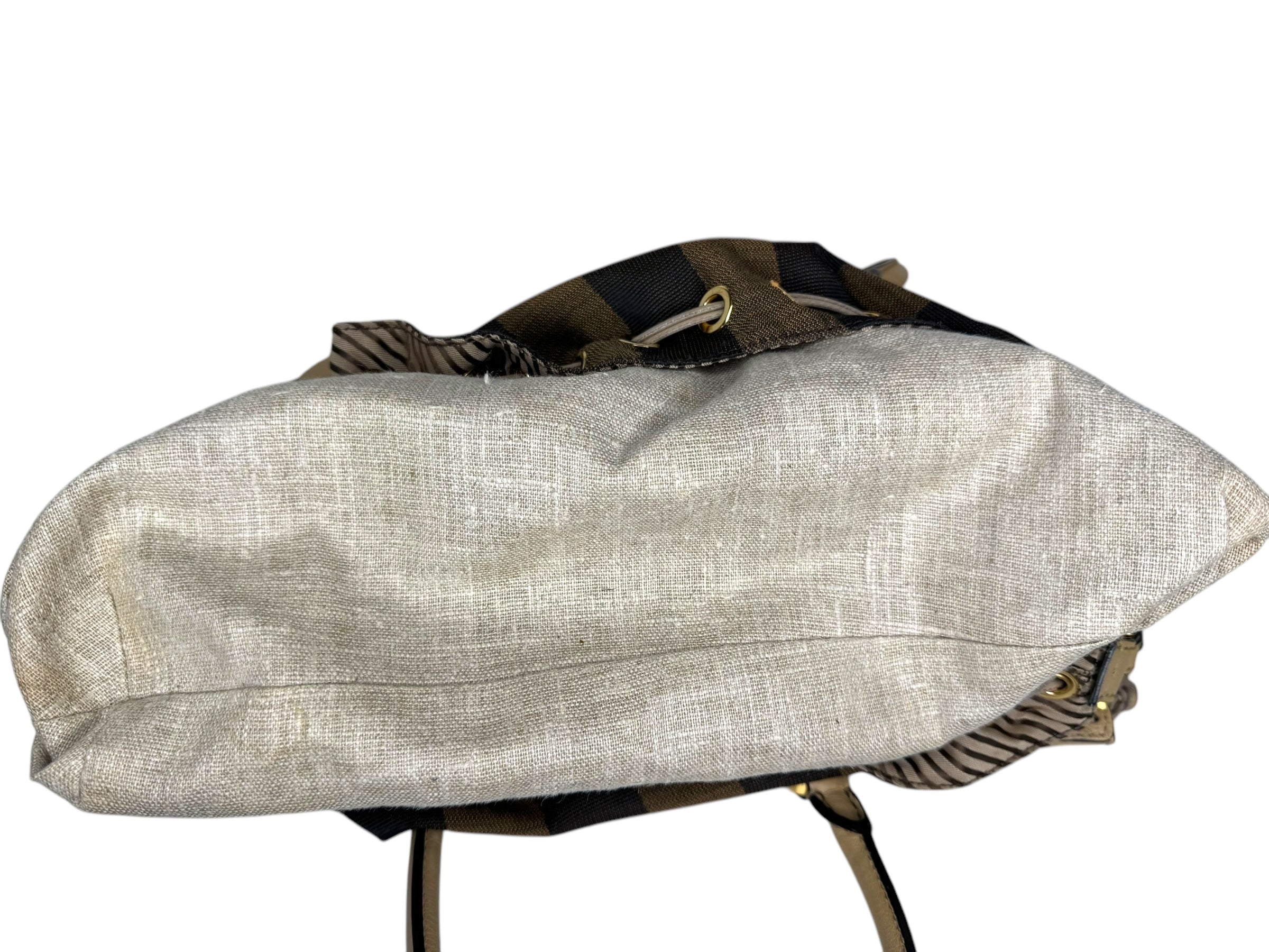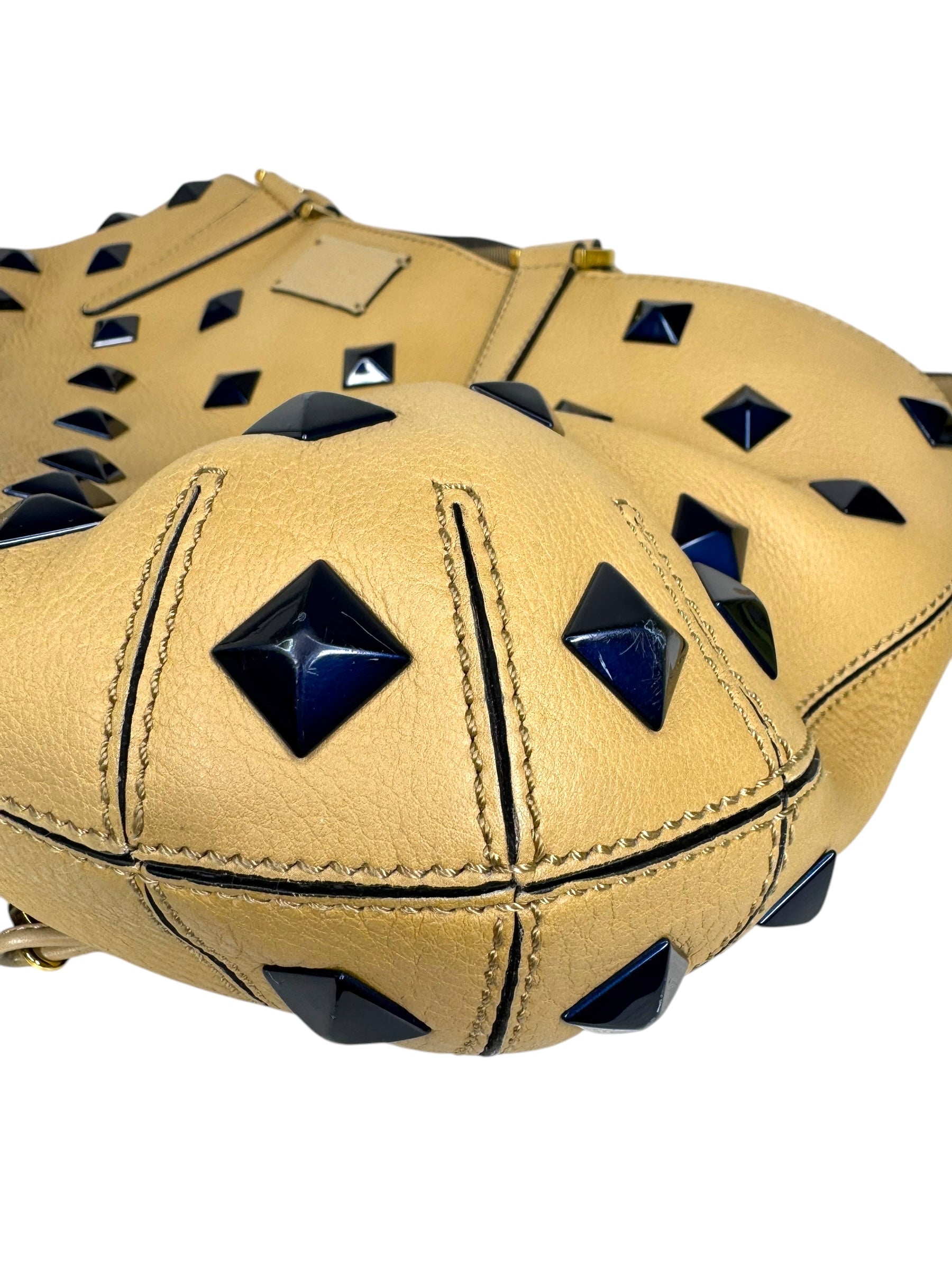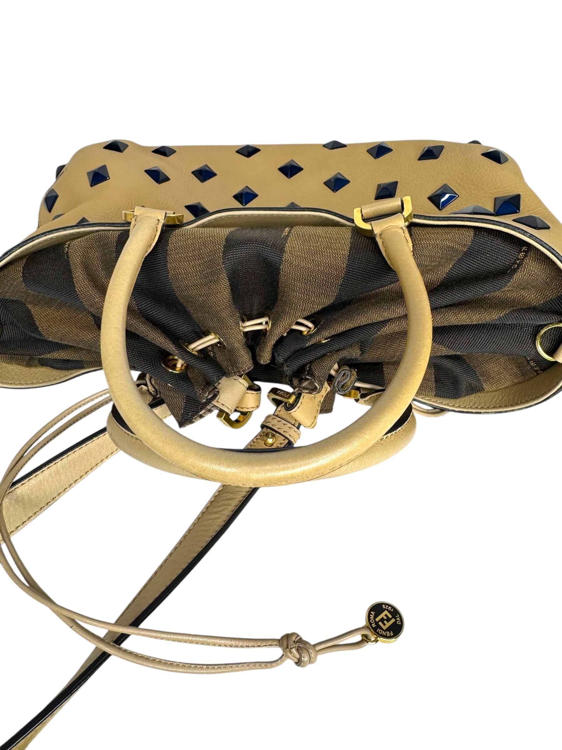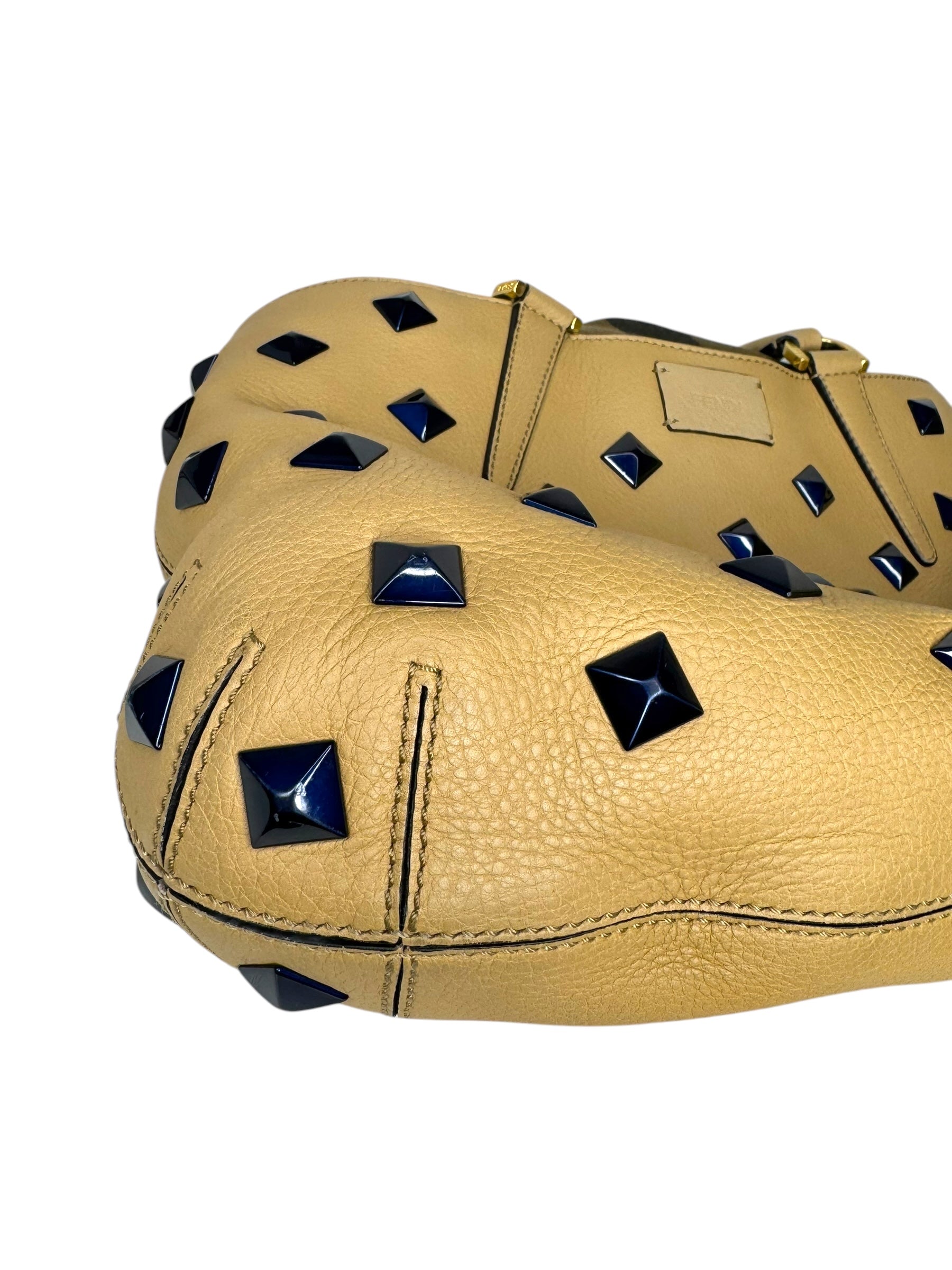 A stylish and sophisticated piece from Fendi’s 2012 Collection, the B Fab Tote is crafted from luxurious neutral leather with the brand’s signature Pequin pattern. Featuring gold-tone hardware and studded accents, this tote blends elegance with a touch of modern edge.